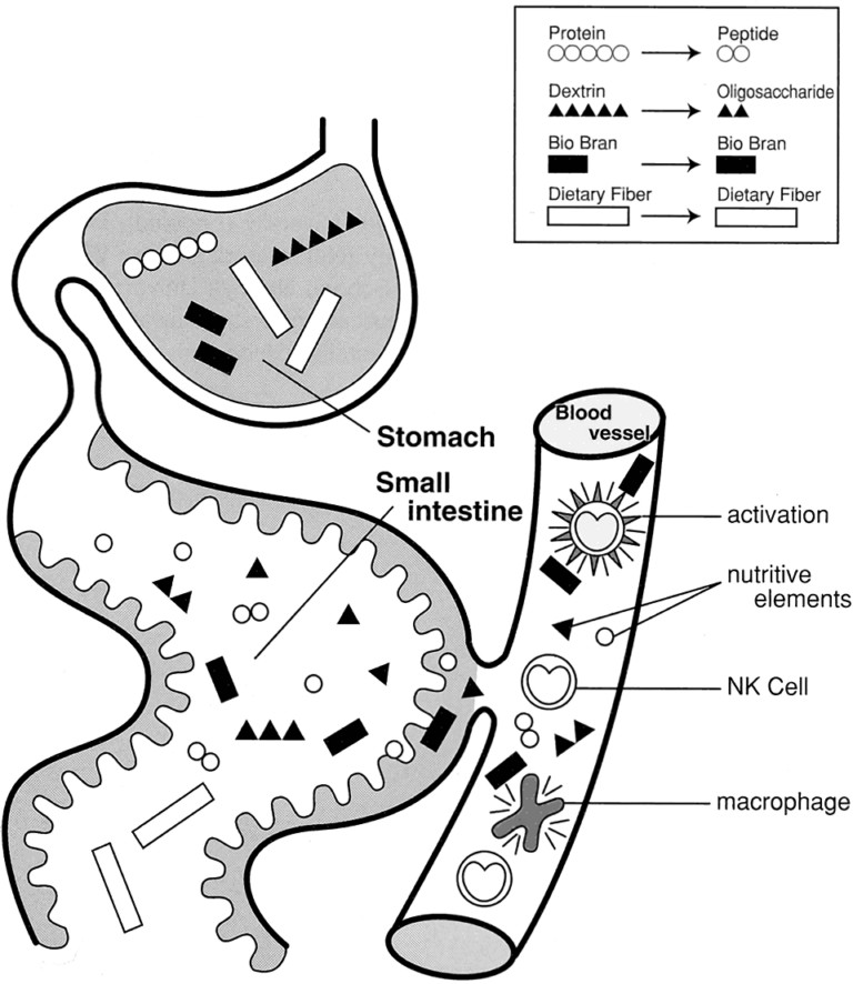BioBran partially enters the blood undigested. Proteins are digested in the stomach and in the duodenum, to be converted into peptides and amino acids, which are then absorbed in the small intestine, entering the blood to become nutritional elements. Dextrin is also digested into oligosaccharides and dextrose ( glucose) and absorbed in the small intestine. BioBran is absorbed in the small intestine in undigested form and enters the blood to stimulate NK cells and macrophages. Passing through the large intestine, dietary fiber in contrast is excreted without being digested or absorbed.
